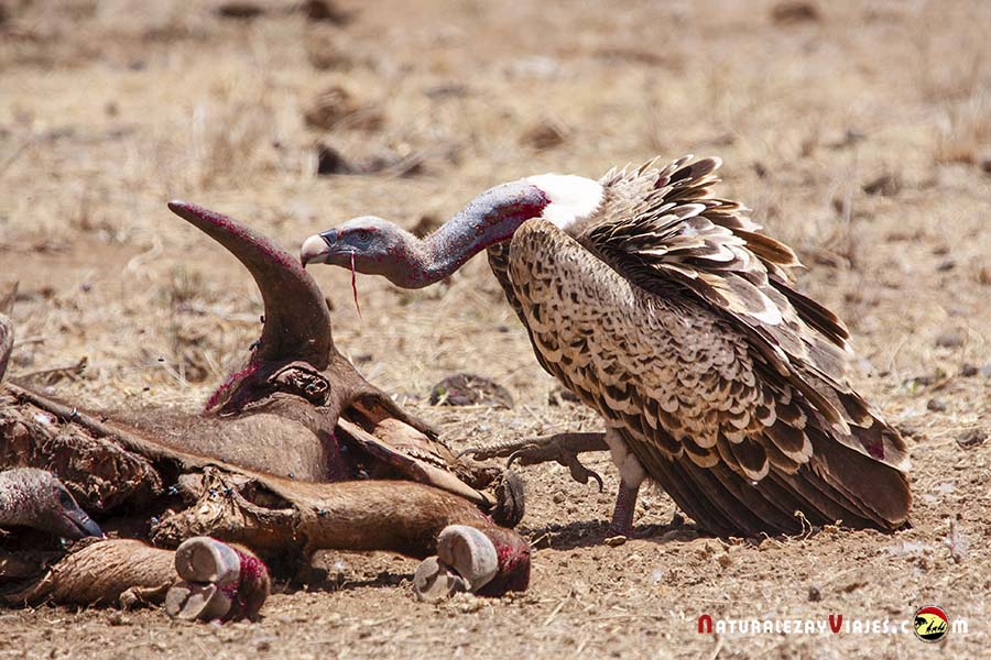 Buitres africanos, de Rupell, Torgos y Marabues buscan carroña entre las inmensas llanuras de la Reserva Nacional Buffalo Springs.